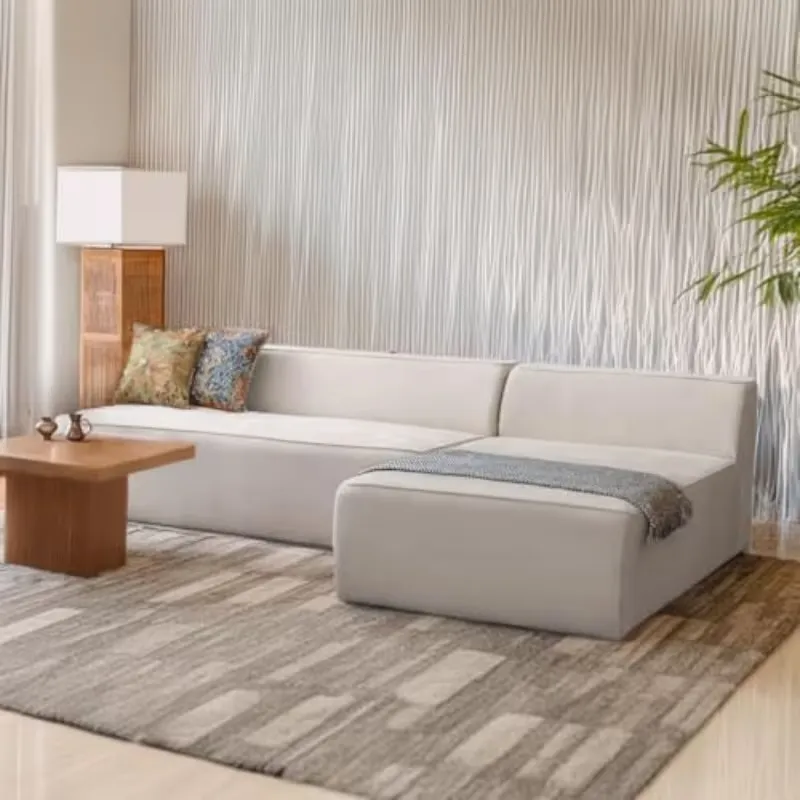 Modern corner sofa bed with a right-facing interchangeable chaise, perfect for living rooms. Features light beige upholstery, space-saving design, and vintage-inspired style. Comfortable and versatile, ideal for flexible room arrangements and adding elegance to any home interior.